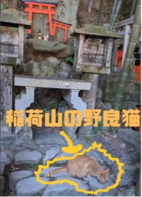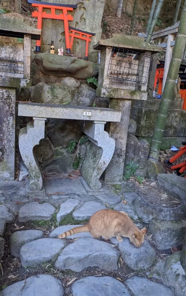 稲荷山へ通じる参道から少し外れた奥に、野良猫がいました。詳しい人に聞くと、何十匹もいるそう。