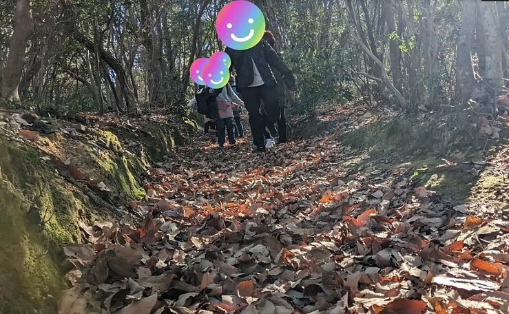 途中 少し脇道にそれたら、落ち葉でふかふかの道でした。みなさん慎重に歩いていきます。