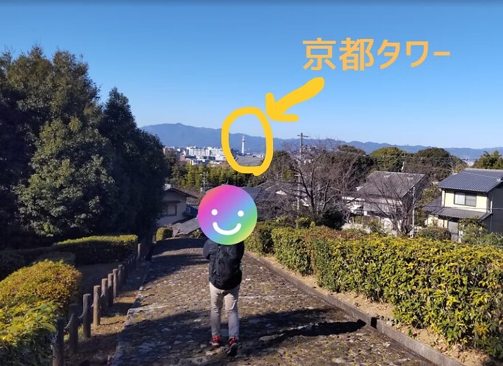 どのような人生を送られたのか。山手で穏やかに過ごされたのか。。御陵は宮内庁の所管で、道がきれいに整備されてました。御陵近くから、目的地の京都タワーが遠くに見えます。